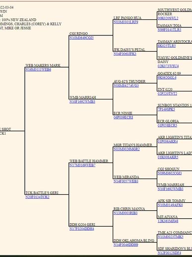 Sire: Pango Hua (Southwest Goldmine's Rocker x Tasman Toia)